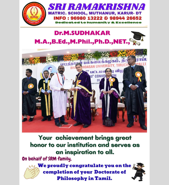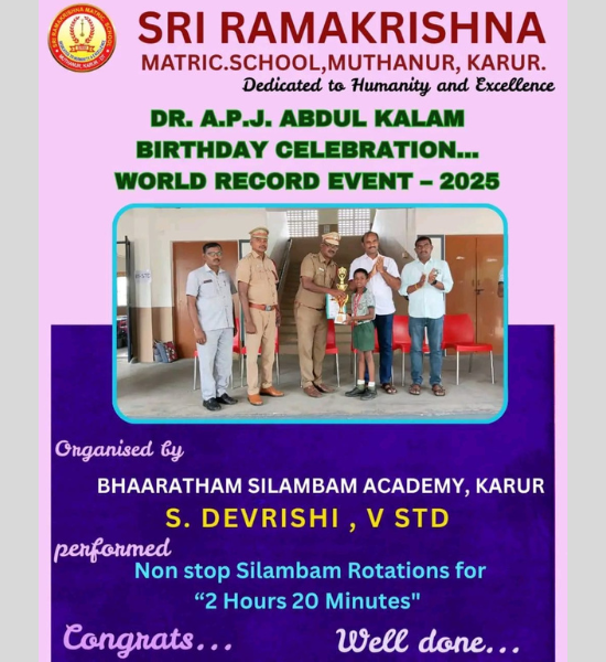 Sri Ramakrishna Matriculation School, established in 2009 under the aegis of Sri Ramakrishna Educational Charitable Trust, is located at Muthanur, Semangi Post, Pugalur Taluk, Karur District – 639117. Since its foundation, the school has stood as a symbol of academic excellence, character building, and innovation in school education. The school caters to Kindergarten through High School, following a well-structured Montessori, Matric, and State Board curriculum.